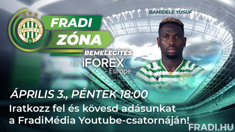 Április 3-án, pénteken 18 órakor kezdődik a Fradi Zóna Bemelegítés by iFOREX Europe vadonatúj epizódja, amelyben klubunk támadójával, Bamidele Yusuffal beszélget a műsorvezető. Szóba kerül az elmúlt időszak kiváló teljesítménye, a Fizz Ligában és az UEL-ben szerzett fontos góljai, és természetesen a hajrájába forduló bajnokság következő meccseinek fontossága – sorban az elsővel, a vasárnapi Debrecen elleni idegenbeli találkozóval.