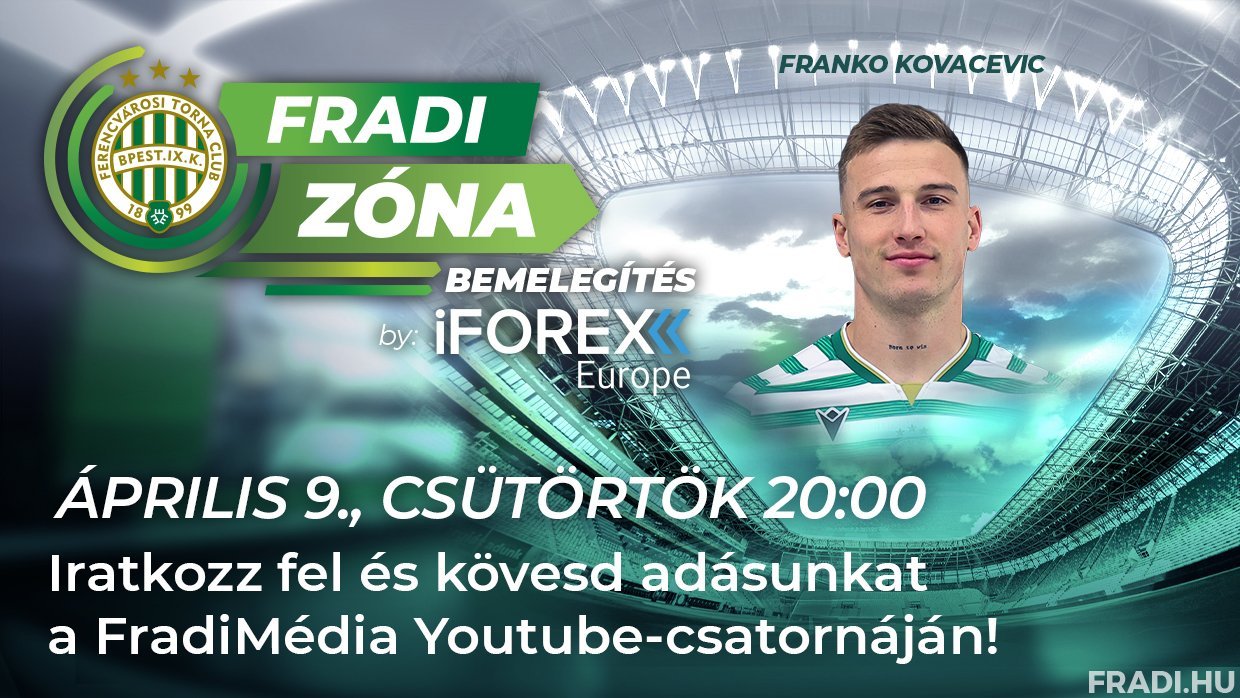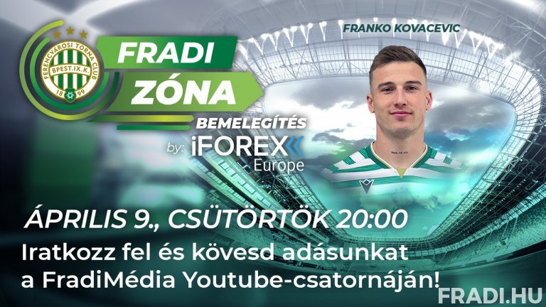 Április 9-én, csütörtökön 20:00 órakor kezdődik a Fradi Zóna Bemelegítés by iFOREX Europe vadonatúj epizódja, amelyben klubunk támadója, Franko Kovacevic beszélget a műsorvezetővel. Szó lesz a beilleszkedésről, a magyar nyelvről és persze a bajnoki címért folytatott csatáról. Fradi Zóna Értékelés Live-hoz, a Fradi Zóna Elemzéshez és a Fradi Zóna Pluszhoz hasonlóan az iFOREX Europe támogatja, műsorainkat az FTC YouTube-csatornáján lehet megtekinteni.