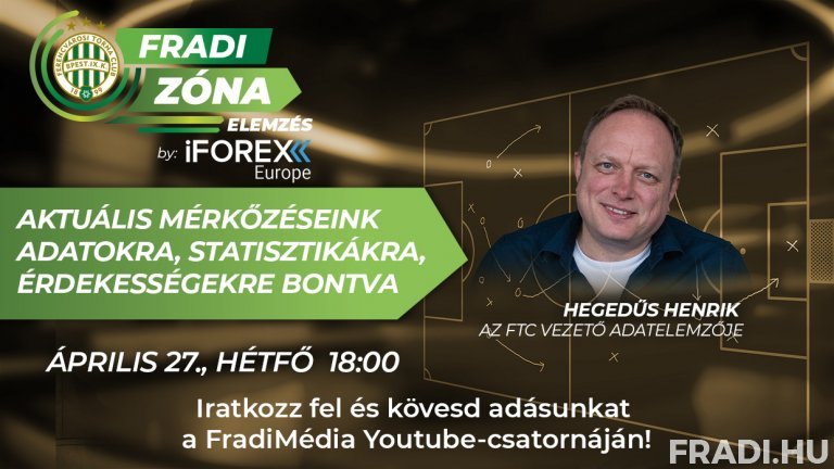 A nagysikerű meccsnapi értékelő műsor után, ahogy azt már az elmúlt hónapokban rendszeres nézőink megszokhatták, hétfőnként újabb exkluzív vodcast következik: a Fradi Zóna Elemzés by iFOREX Europe adásában az aktuális bajnokinkat követő hétfőn Jáky Gergely műsorvezető az FTC vezető adatelemzőjével, Hegedűs Henrikkel beszélget, aki a legutóbbi mérkőzésből készített friss statisztikákkal, kimutatásokkal, érdekességekkel készül.
