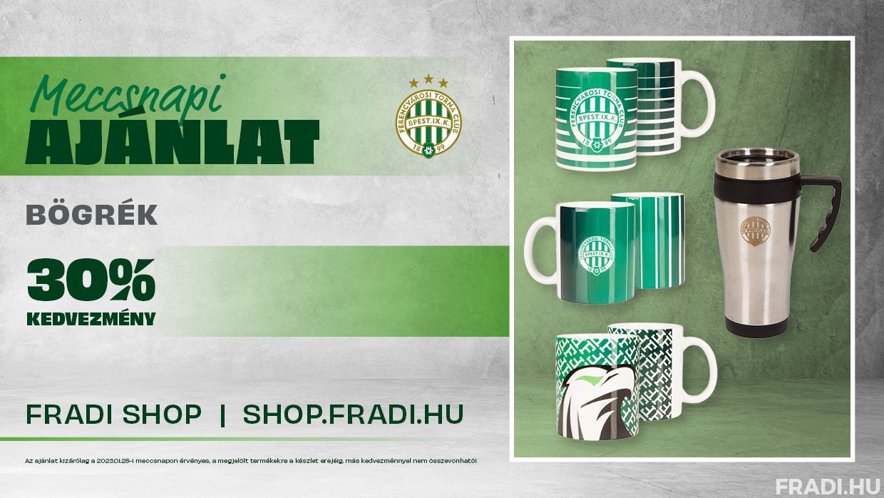 Szurkolóink az év első hazai mérkőzése alkalmából rögtön négy bögrénket (címeres bögre, csíkos bögre címerrel, zöld sasos bögre, thermo bögre) is 30 százalék kedvezménnyel szerezhetik be. Az akció keretében az előbbi három, 330 ml űrtartalmú termünket mind 1743 forintért, míg a hideget és a meleget is egyaránt 5 órán tartó thermo bögrénket 2793 forintért vásárolhatják meg.