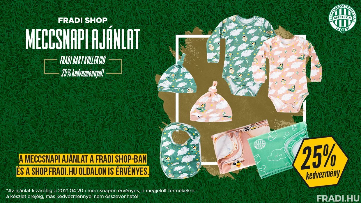 Szurkolóink többféle mintával ellátott ruházattal és több más babatermékkel találkozhatnak a Fradi baby kollekcióban. A legkisebb fradista fiúknak és lányoknak egyaránt beszerezhetik kedvenc darabjukat, mint például a babazöld és babarózsaszín sapka, a babazöld és babarózsaszín takaró, a babazöld partedli, három különböző mintában elérhető kezeslábas, rövid és hosszú ujjú body négy-négy különböző mintában, illetve egy babazöld ujjatlan rugdalozó.