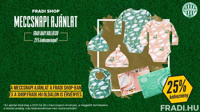 Magyar bajnoki címvédő és listavezető férfi labdarúgócsapatunk április 20-án, kedden 20.00-tól zárt kapuk mögött fogadja az Újpestet a Groupama Arénában az NB I 30. fordulójában. Amint azt szurkolóink már megszokhatták a hazai bajnokira ezúttal is meccsnapi ajánlattal készülünk. Ezúttal a Fradi baby kollekció darabjait szerezhetik be 25% kedvezménnyel.