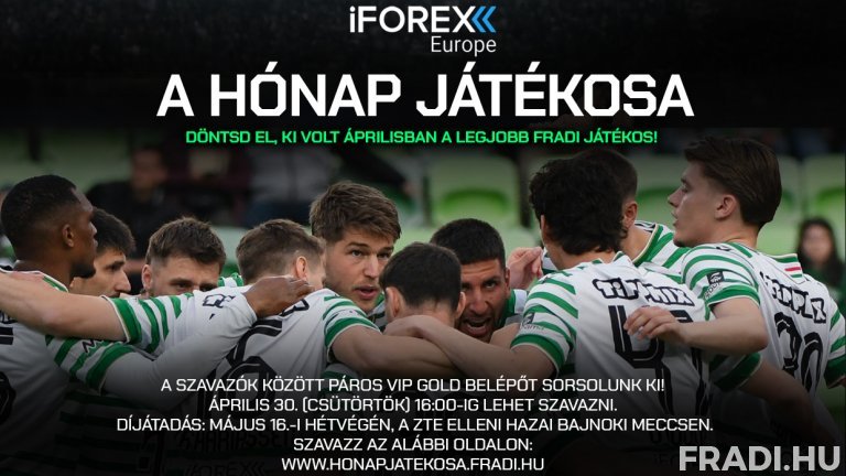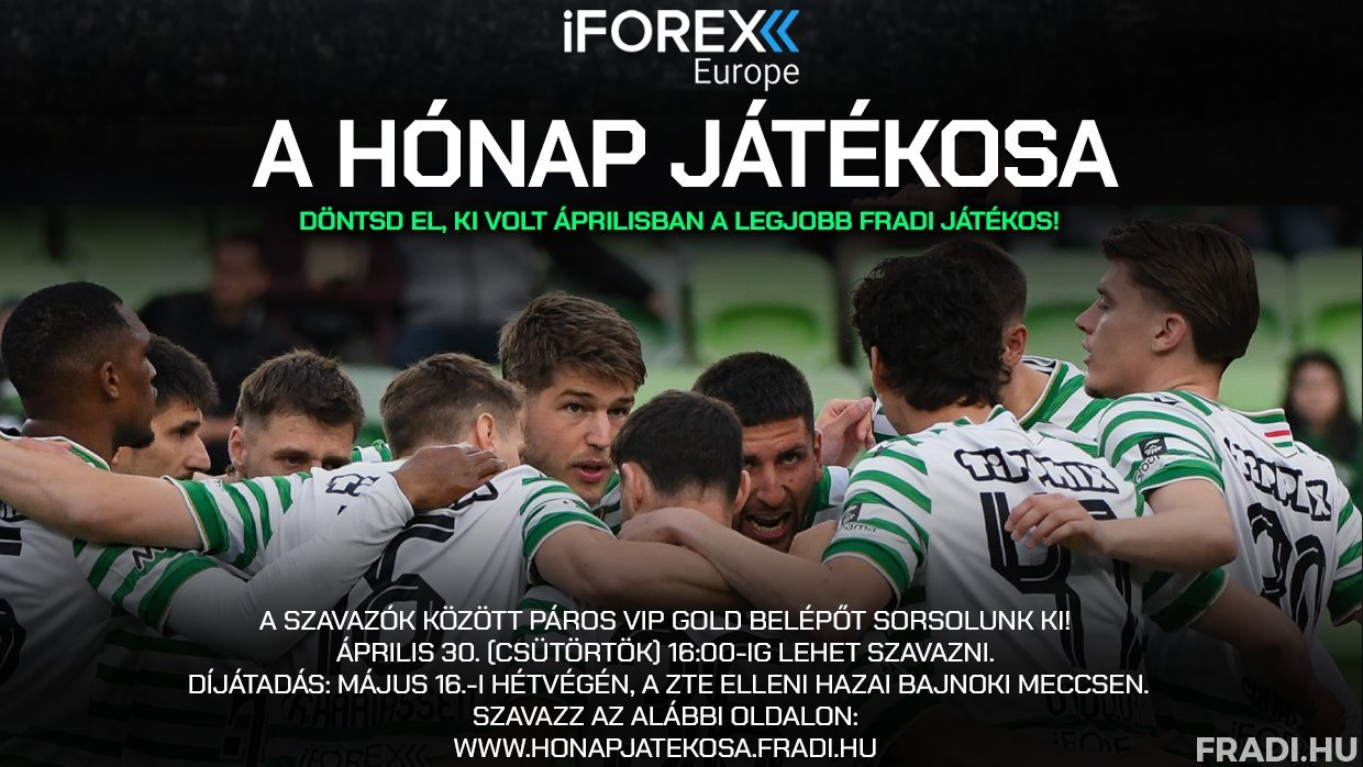 Az iFOREX Europe Hónap Játékosa-díjat az a férfi labdarúgónk kapja, akire a legtöbb szurkolónk szavaz a honapjatekosa.fradi.hu oldalon. Bárkire lehet voksolni, kapusra, hátvédre, középpályásra, csatárra, kezdőjátékosra, esetleg cserére, a lényeg, hogy az adott hónapban az illető – bármelyik sorozatban - legalább 45 percet a pályán töltött, és teljesítményével hozzájárult a csapat sikereihez. Megéri szavazni, hiszen a voksolók között értékes nyereményt sorsolunk ki: a fődíj egy páros VIP-belépő valamelyik hazai bajnoki mérkőzésünkre!