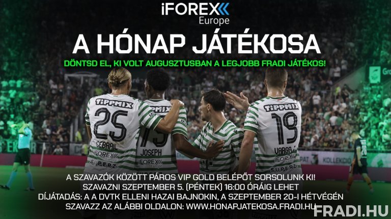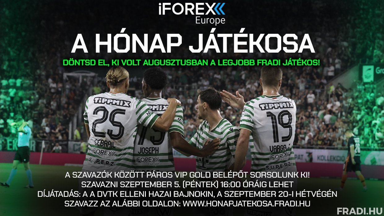 Az iFOREX Europe Hónap Játékosa-díjat az a férfi labdarúgónk kapja, akire a legtöbb szurkolónk szavaz a honapjatekosa.fradi.hu oldalon. Bárkire lehet voksolni, kapusra, hátvédre, középpályásra, csatárra, kezdőjátékosra, esetleg cserére, a lényeg, hogy az adott hónapban az illető – bármelyik sorozatban - legalább 45 percet a pályán töltött, és teljesítményével hozzájárult a csapat sikereihez. Megéri szavazni, hiszen a voksolók között értékes nyereményt sorsolunk ki: a fődíj egy páros VIP-belépő valamelyik hazai bajnoki mérkőzésünkre!