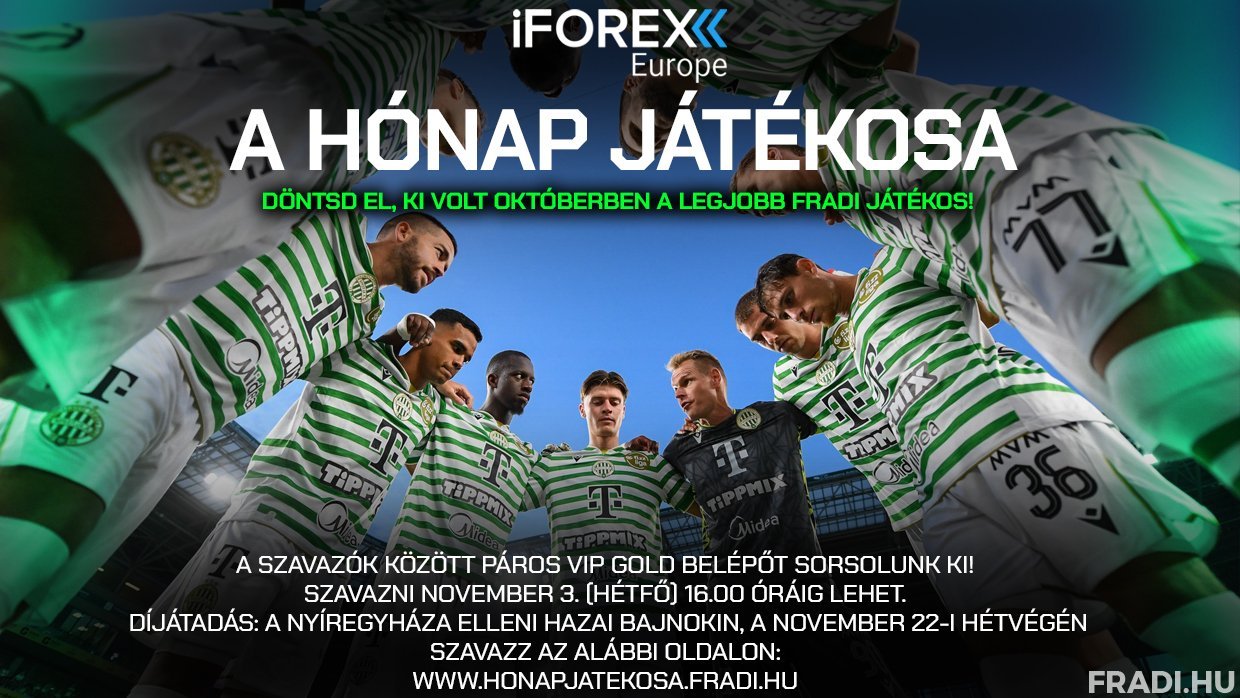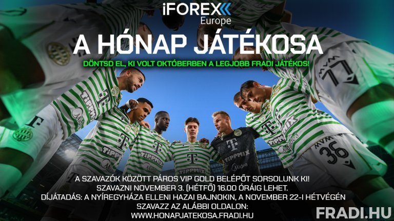 Az iFOREX Europe Hónap Játékosa-díjat az a férfi labdarúgónk kapja, akire a legtöbb szurkolónk szavaz a honapjatekosa.fradi.hu oldalon. Bárkire lehet voksolni, kapusra, hátvédre, középpályásra, csatárra, kezdőjátékosra, esetleg cserére, a lényeg, hogy az adott hónapban az illető – bármelyik sorozatban - legalább 45 percet a pályán töltött, és teljesítményével hozzájárult a csapat sikereihez. Megéri szavazni, hiszen a voksolók között értékes nyereményt sorsolunk ki: a fődíj egy páros VIP-belépő valamelyik hazai bajnoki mérkőzésünkre!