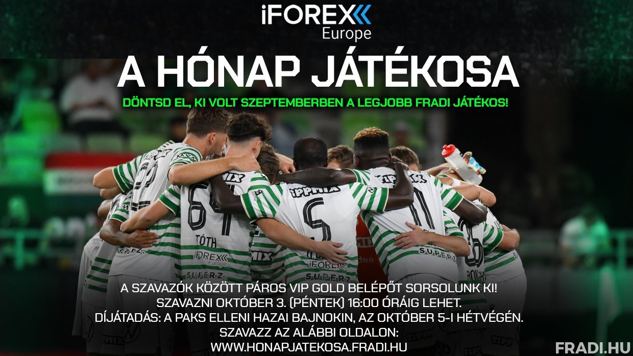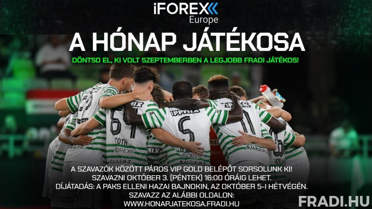 Az iFOREX Europe Hónap Játékosa-díjat az a férfi labdarúgónk kapja, akire a legtöbb szurkolónk szavaz a honapjatekosa.fradi.hu oldalon. Bárkire lehet voksolni, kapusra, hátvédre, középpályásra, csatárra, kezdőjátékosra, esetleg cserére, a lényeg, hogy az adott hónapban az illető – bármelyik sorozatban - legalább 45 percet a pályán töltött, és teljesítményével hozzájárult a csapat sikereihez. Megéri szavazni, hiszen a voksolók között értékes nyereményt sorsolunk ki: a fődíj egy páros VIP-belépő valamelyik hazai bajnoki mérkőzésünkre!