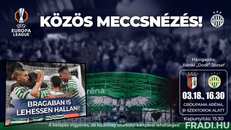 A Genk, a Salzurg, a Fenerbache és a Nottingham elleni összecsapást követően a Ludogorec ellen is megmutattuk, mire képes a csodálatos Fradi-tábor ereje, még akkor is, amikor többszáz kilométer választja el csapatunktól. Tegyünk így most is, és március 18-án, rendhagyó módon szerdán, 16:30-tól a Braga elleni találkozó ideje alatt is varázsoljunk fergeteges hangulatot!
