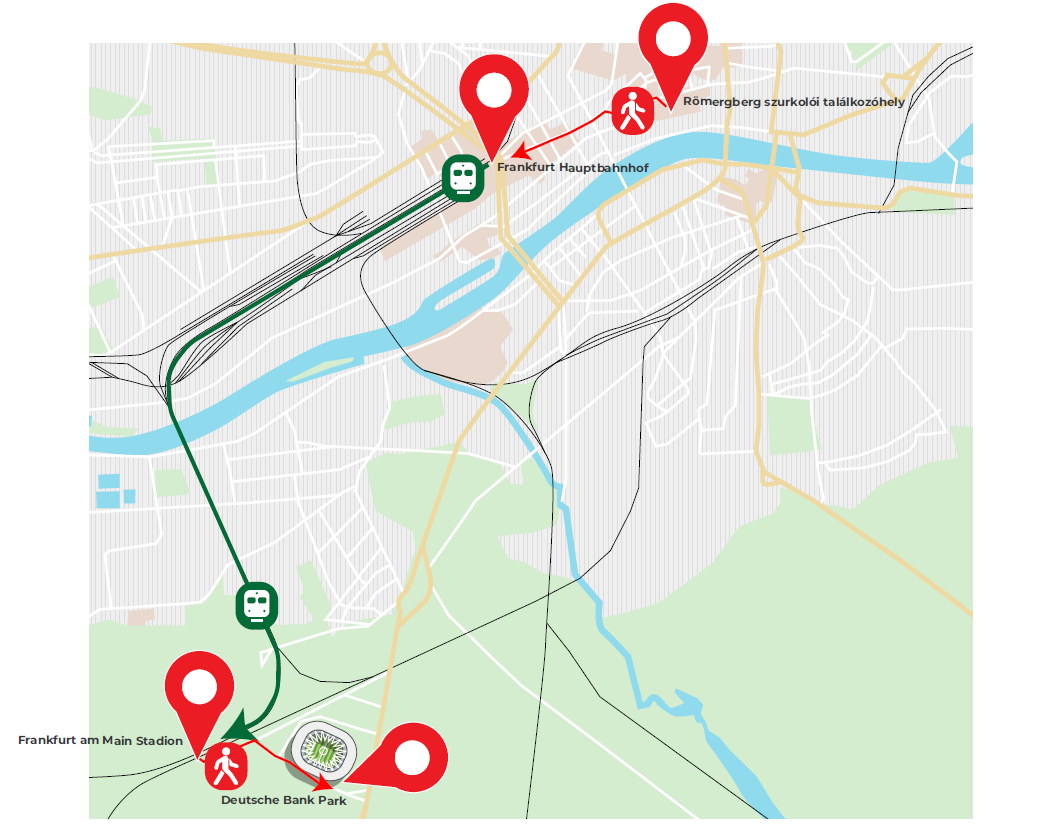 A Römerberg találkozóhelyről rendőri kísérettel vonulnak drukkereink a frankfurti főpályaudvarra, azaz a Frankfurt Hauptbahnhofhoz, ahonnan kötöttpályás közlekedéssel, egy külön a vendégszurkolók szállítására forgalomba állított S-bahn szerelvényen, együtt utaznak majd a Frankfurt Stadionhoz vezető Frankfurt am Main Stadion megállóhelyig. Innen pár perces sétát követően jutnak el a vendégszektorhoz.