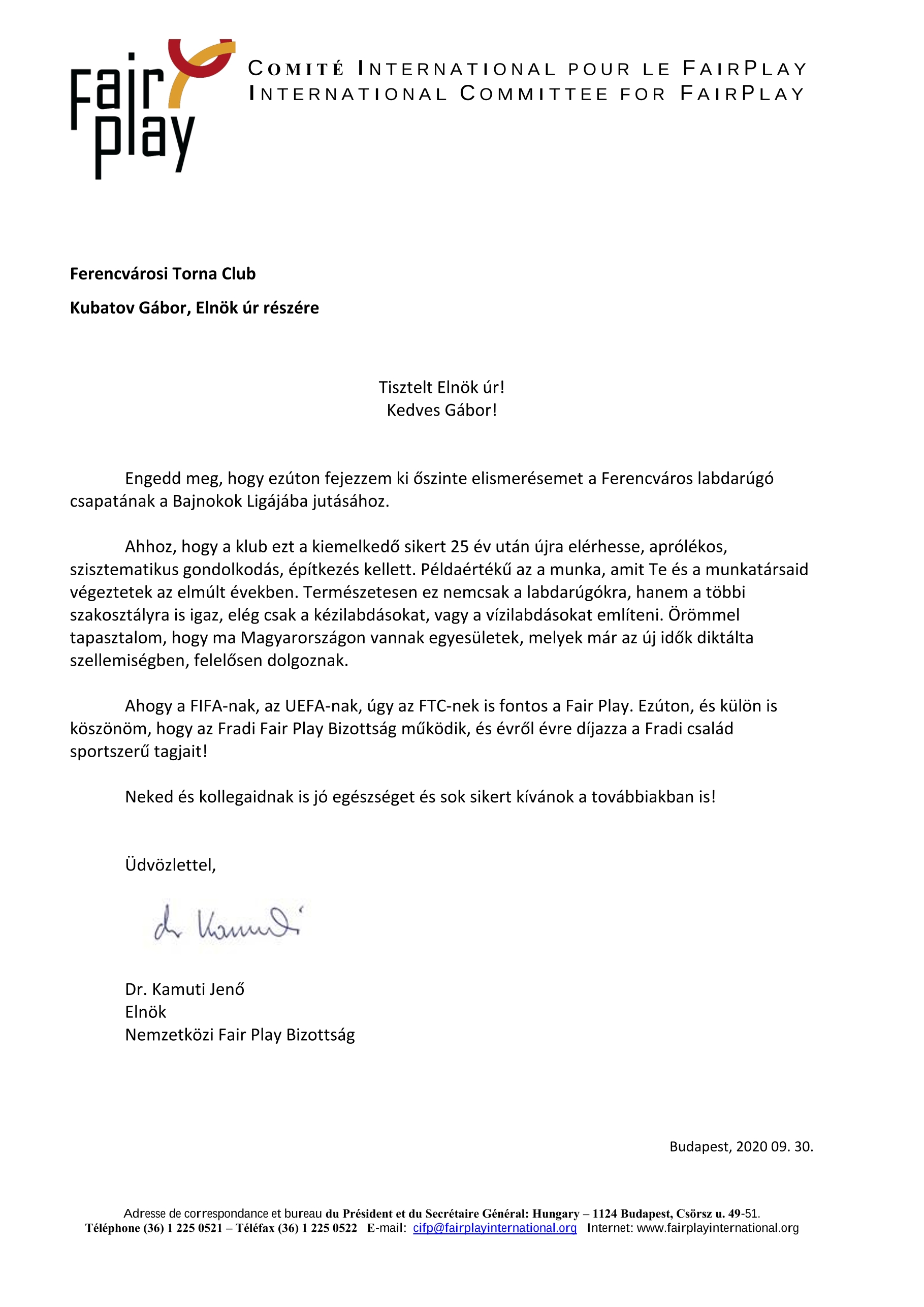- Ahhoz, hogy a klub ezt a kiemelkedő sikert 25 év után újra elérhesse, aprólékos, szisztematikus gondolkodás, építkezés kellett. Példaértékű az a munka, amit Te és a munkatársaid végeztetek az elmúlt években. Természetesen ez nemcsak a labdarúgókra, hanem a többi szakosztályra is igaz, elég csak a kézilabdásokat, vagy a vízilabdásokat említeni. Örömmel tapasztalom, hogy ma Magyarországon vannak egyesületek, melyek már az új idők diktálta szellemiségben, felelősen dolgoznak – áll Kamuti Jenő levelében, amely alább teljes terjedelmében is elolvasható.