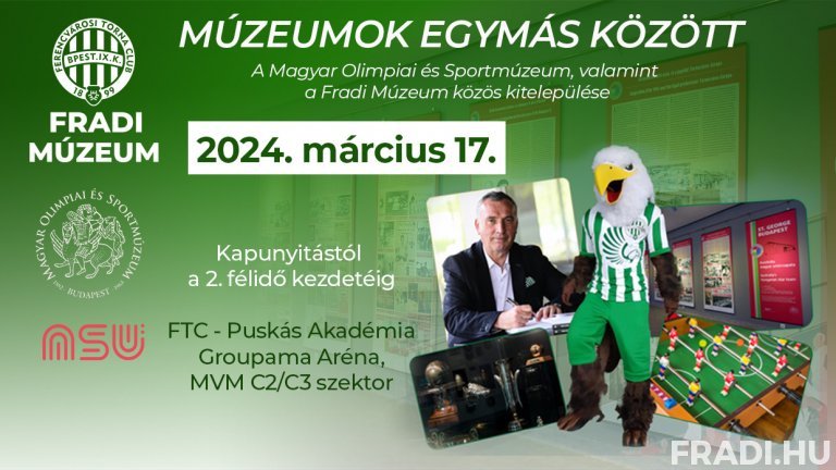 Férfi labdarúgócsapatunk március 17-én, vasárnap 14.45-kor fogadja a Puskás Akadémiát a Groupama Arénában, az OTP Bank Liga 25. fordulójában. A mérkőzés előtt tematikus programként ajánljuk szurkolóink figyelmébe a Fradi Múzeum és a Magyar Olimpiai és Sportmúzeum közös kitelepülését. A két intézmény hosszú évek óta kitűnő kapcsolatot ápol egymással, ennek gyümölcse lesz az esemény.