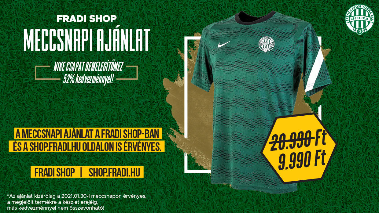Férfi labdarúgóink a bajnokságban a Kisvárdát fogadják január 30-án, szombaton 17.00 órától a Groupama Arénában, zárt kapuk mögött. Amint azt szurkolóink korábban már megszokhatták, a hazai bajnokira ezúttal is meccsnapi ajánlattal készülünk, amely ezúttal csapatunk Nike bemelegítőmeze. Különleges akciónk során most több, mint 50% kedvezménnyel, 20.990 forint helyett 9.990 forintért juthatnak hozzá labdarúgócsapatunk bemelegítőmezéhez.