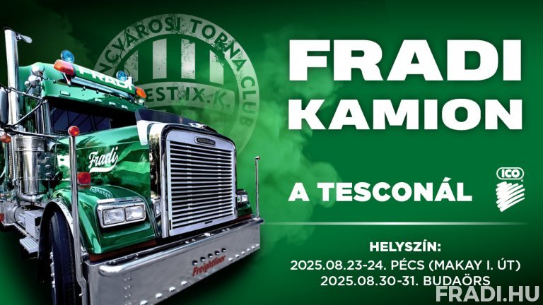 Augusztus 23-én és augusztus 24-én Pécsen, a Tesco parkolójában lesz megtekinthető az FTC országjáró járműve, a Fradi Kamion, majd egy héttel később új helyszínen, a budaörsi Tesco parkolójában augusztus 30-án és augusztus 31-én.