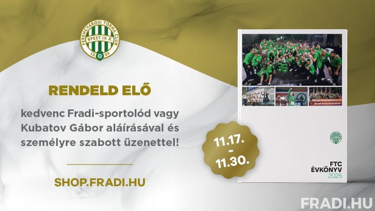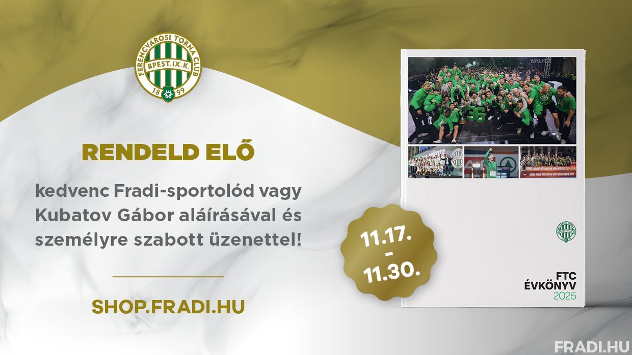Szurkolóink november 17., hétfőtől, egészen november 30., vasárnapig előrendelhetik a 2025-ös FTC Évkönyvet, amelyben klubunk idei esztendejének összes fontos pillanatáról olvashatnak, közte labdarúgóink és vízilabdázóink kiemelkedő sikereiről. A kötetet első körben kizárólag webáruházunkban, a shop.fradi.hu-n szerezhetik be 5.990 Forintért, 1.190 forintos kiszállítási díjjal.