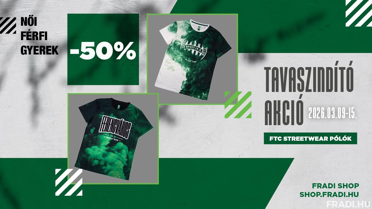 Márciust írunk, kitavaszodik, zöldbe öltözik a természet, öltözzön zöldbe ön is! Március 9-től március 15-ig Tavaszindító akciót tartunk a Fradi Shopban. Egy héten át 50 százalék kedvezménnyel lehet megvásárolni számos, női, férfi és gyermek kereknyakú FTC Streetwear pólót.