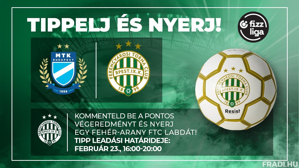 Itt az újabb remek alkalom, hogy szurkolóink különleges Fradi-ajándékot nyerjenek! Figyelje a Fradi Facebook-oldalát, ahová az MTK Budapest elleni Fizz Liga-mérkőzés előtt négy órával kitesszük a "Tippelj és nyerj!” posztunkat, ez alá várjuk a pontos tippeket arról, hogy mi lesz a találkozó pontos végeredménye.