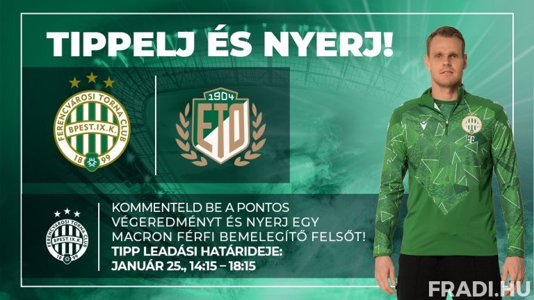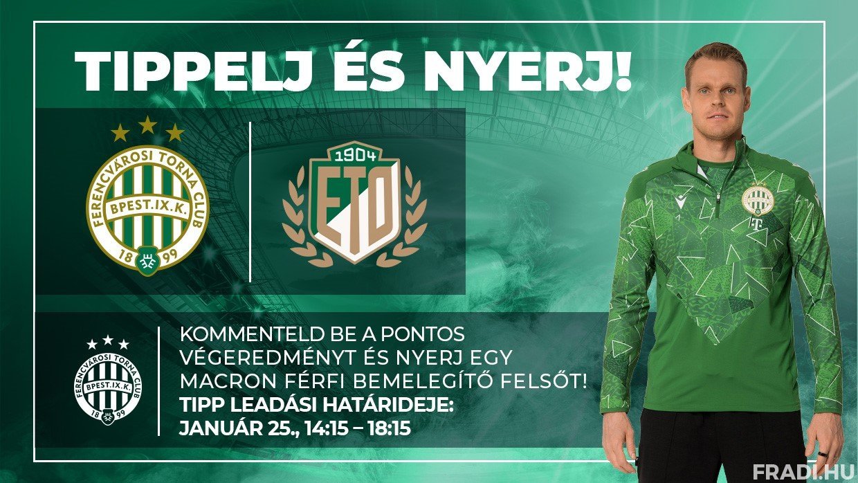 Itt az újabb remek alkalom, hogy szurkolóink különleges Fradi-ajándékot nyerjenek! Figyelje a Fradi Facebook-oldalát, ahová az ETO FC elleni Fizz Liga-mérkőzés előtt négy órával kitesszük a "Tippelj és nyerj!” posztunkat, ez alá várjuk a pontos tippeket arról, hogy mi lesz a találkozó pontos végeredménye.