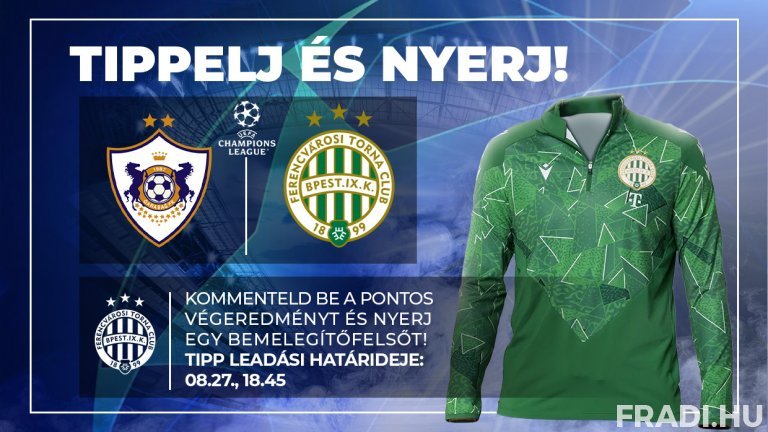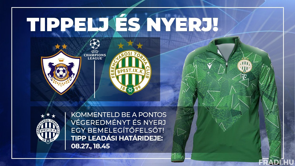 Itt az újabb remek alkalom, hogy szurkolóink különleges Fradi-ajándékot nyerjenek! Figyelje a Fradi Facebook-oldalát, ahová az azeri Qarabag elleni szerdai Bajnokok Ligája-playoffmérkőzésünk visszavágója előtt négy órával kitesszük a “Tippelj és nyerj!” posztunkat, ez alá várjuk a pontos tippeket arról, hogy mi lesz a találkozó pontos végeredménye.