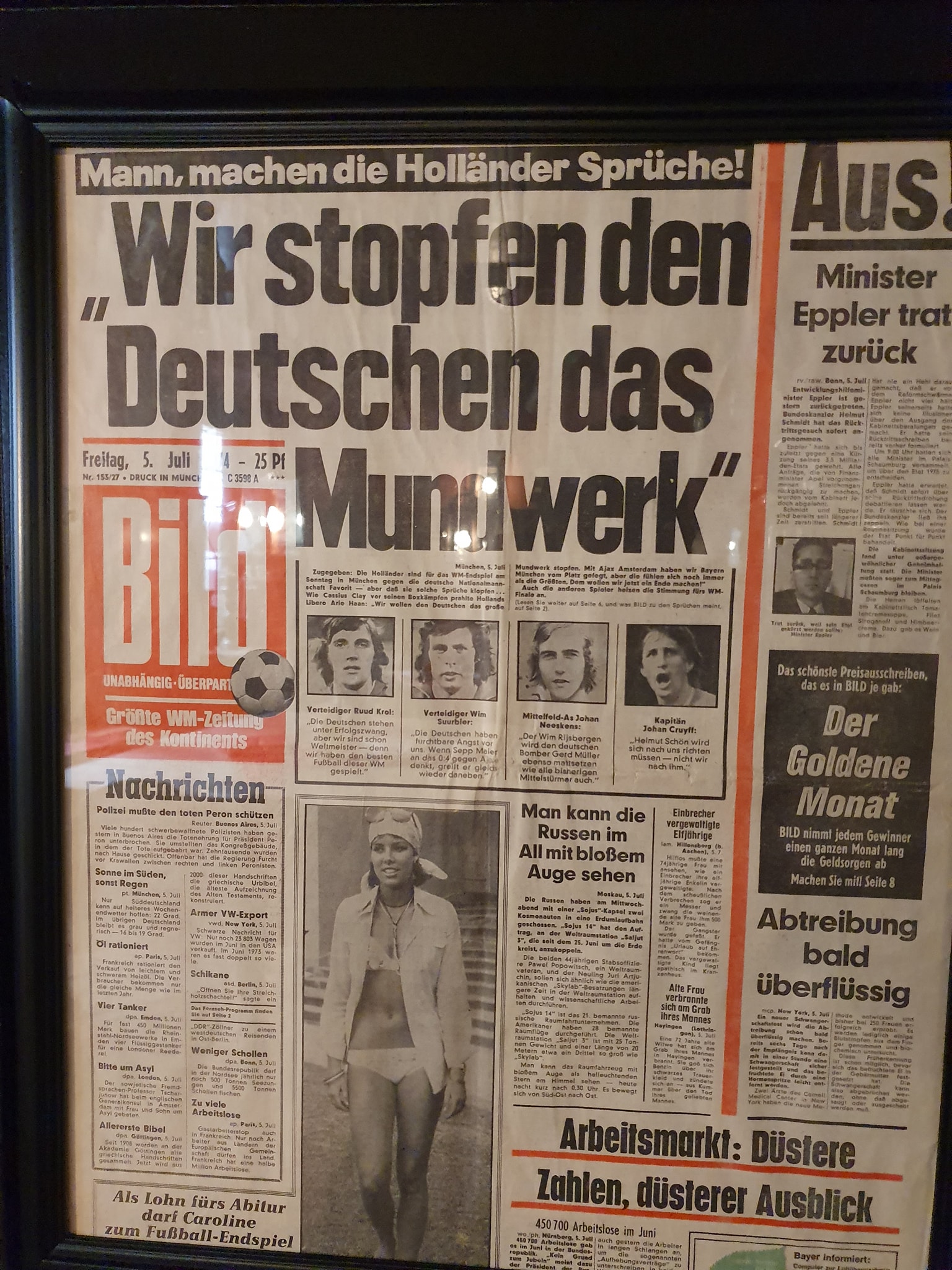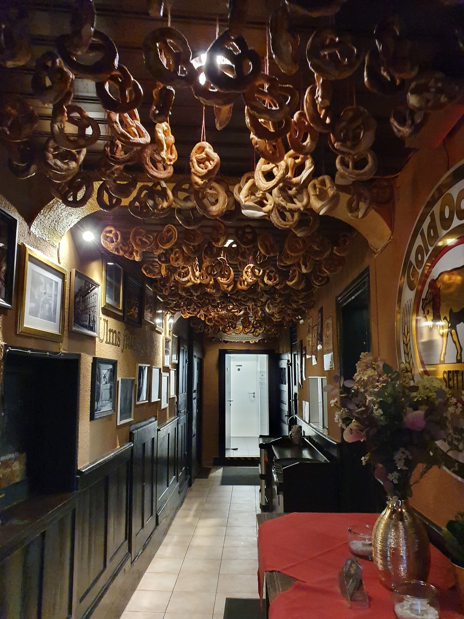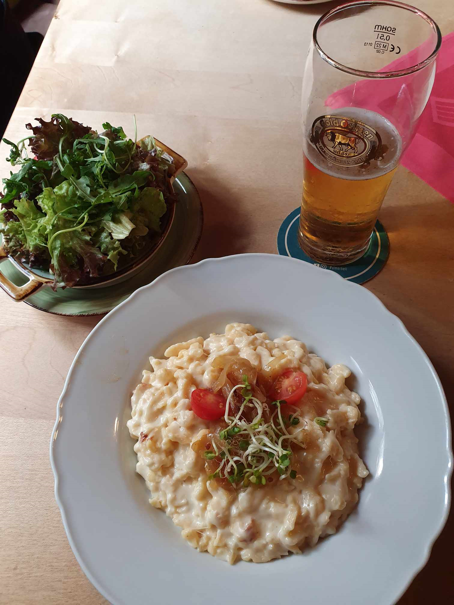 A helyi gyönyörű épületek, sétálóutcák és éttermek felfedezése után egy hangulatos bajor kocsmába rohantunk be egy kiadós zuhé elől. Itt a falakon az újságok az 1974-es világbajnokság döntőjét hirdették, amikor is az NSZK 2-1-re legyőzte a Johann Cruyff-fal felálló Hollandiát. A plafonon pedig perecek lógtak. Egy sváb helyi ételt a Käsespätzlét is megkóstoltuk, nokedli, sajt és saláta, ajánljuk mindenkinek, aki erre jár.