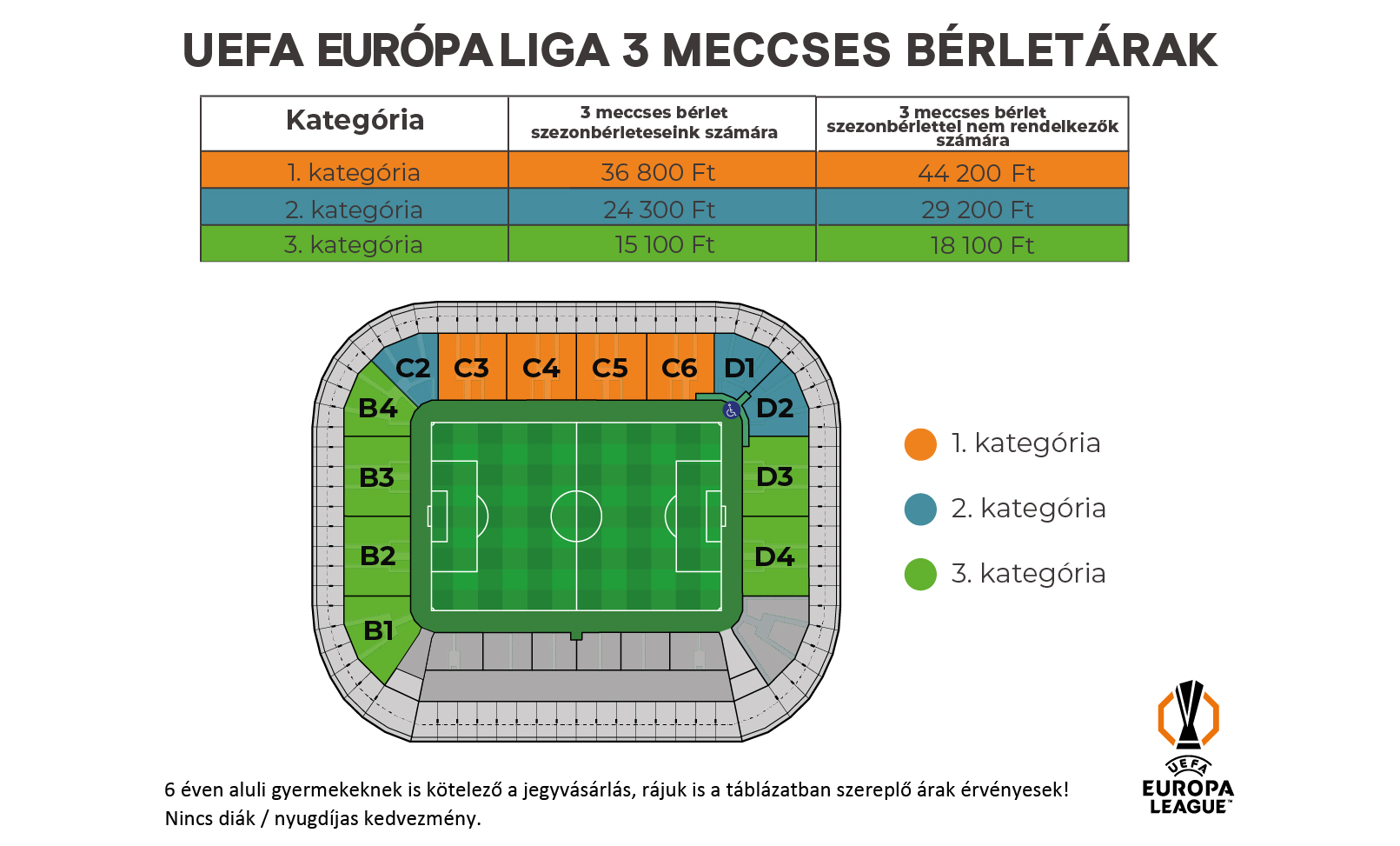 Továbbra nincs sem diák, sem pedig nyugdíjas kedvezmény az UEL-főtáblás mérkőzésekre, valamint a 7 éven aluli gyermekeknek is kötelező a jegyvásárlás, rájuk is a táblázatban szereplő árak érvényesek! A mozgáskorlátozott kedvezmény is a csak a mozgáskorlátozott szektorra érvényesíthető. A gyermekek számára 0 éves kortól is kell jegyet vásárolni, illetve 7 év alatti gyermeknek is csak szurkolói kártyával lehet belépőt vásárolni.