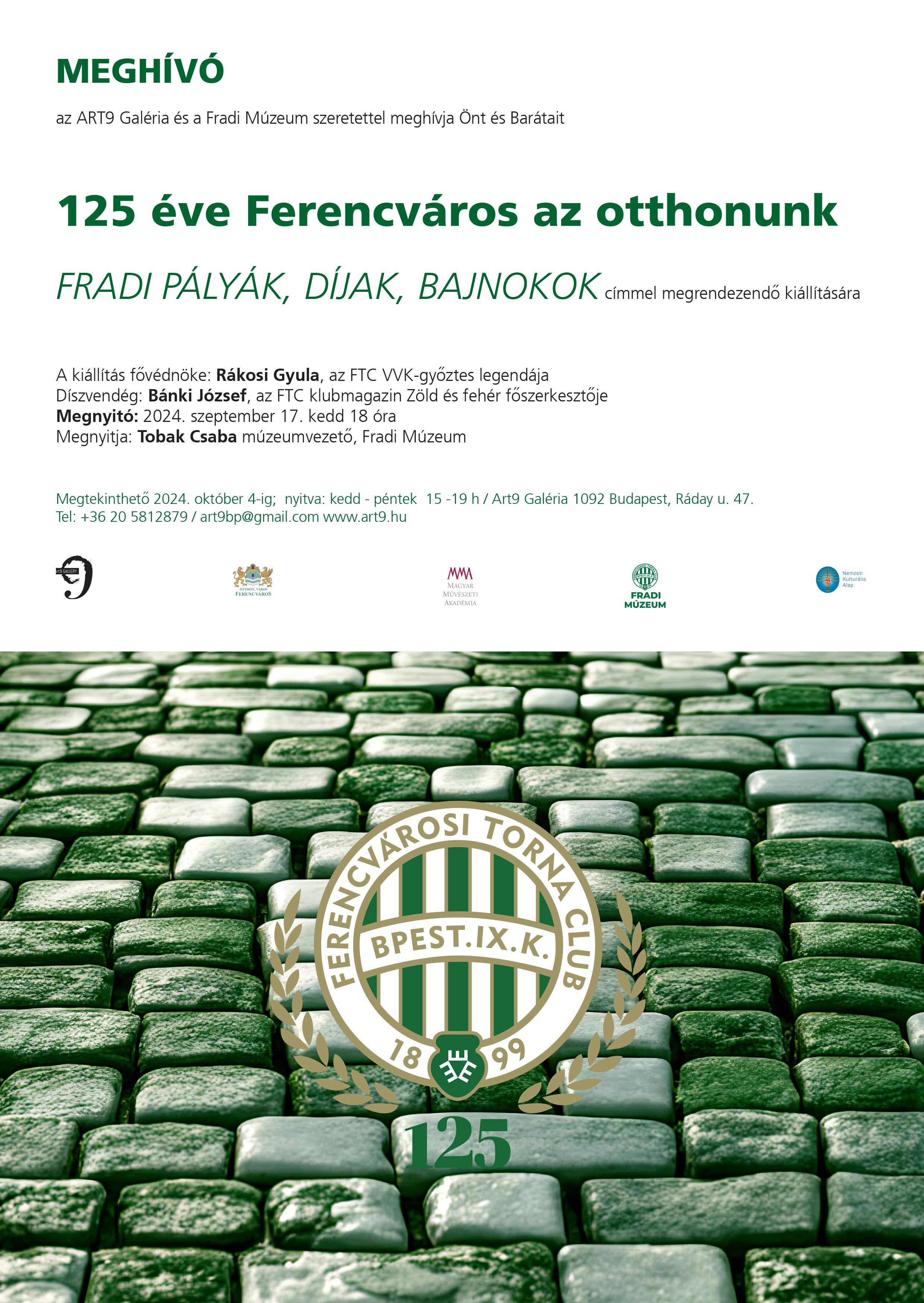 Szeptember 17-én, kedden 18.00-tól kerül megrendezésre az ART9 Galéria és a Fradi Múzeum "125 éve Ferencváros az otthonunk – Fradi pályák, díjak, bajnokok" című kiállításának megnyitója a Ráday utcában.
