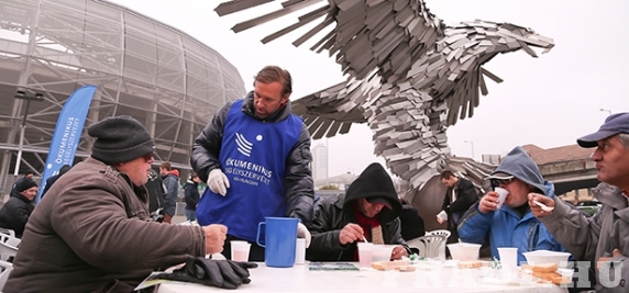 2015 a társadalmi felelősségvállalás éve a Ferencvárosi Torna Clubnál. Ennek szellemében labdarúgó-csapatunk tagjai ma kora délután a Groupama Aréna előtt meleg ételt osztottak a rászorulóknak. Ötszáz embernek jutott a babgulyásból és a forró teából.