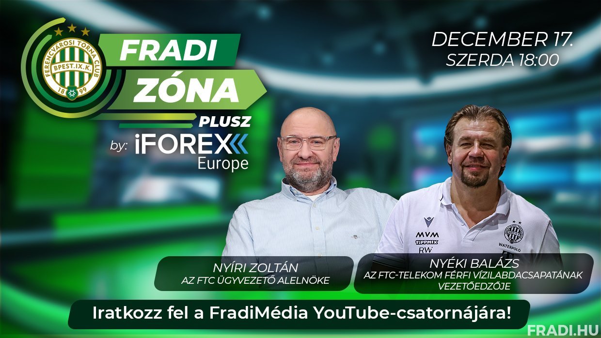A Fradi Zóna Plusz by iFOREX Europe legújabb adását december 17-én, szerdán 18.00-tól követhetik a FradiMédia hivatalos YouTube-csatornáján. Ezúttal klubunk ügyvezető alelnökével, Nyíri Zoltánnal, valamint férfi vízilabdacsapatunk vezetőedzőjével, Nyéki Balázzsal beszélgettünk az FTC-Telekom elképesztő sikerekben gazdag 2025-ös évéről.