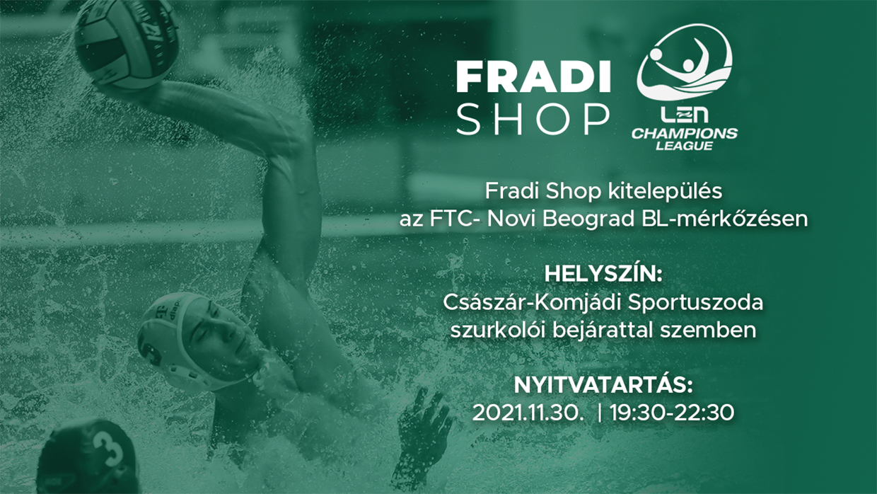 A férfi vízilabda Bajnokok Ligája csoportkörének A-csoportjában a görög Olympiakosz elleni bravúros döntetlen után ezúttal a Novi Beograd lesz a legutóbbi idényt ezüstérmesként záró FTC-Telekom Waterpolo vendége. A mérkőzés 20.30-kor kezdődik a Császár-Komjádi Sportuszodában, amelynek szurkolói bejáratával szemben 19.30 és 22.30 között ott lesz a Fradi Shop kitelepülése is!