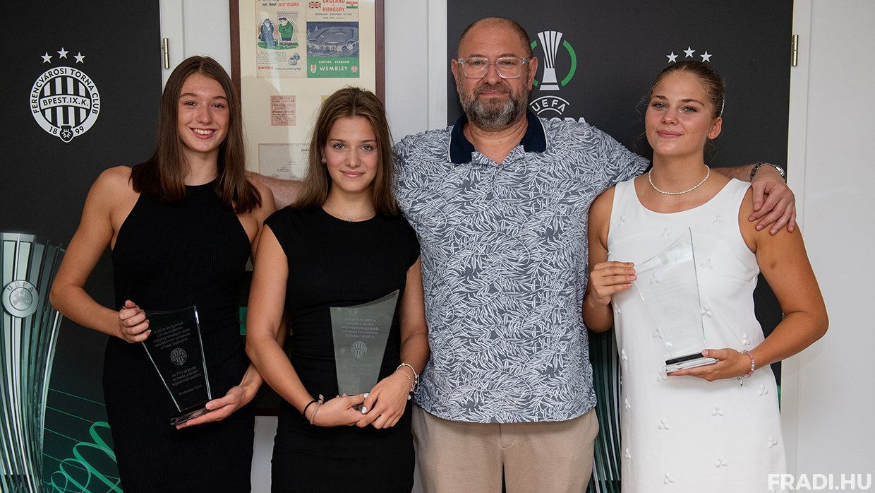 A nemzeti csapat három ferencvárosi játékosa, Füle Barbara, Szalkai Hanga és Kiss Emma (a képen balról jobbra) teljesítményükkel kiérdemelték az Elnöki Elismerő Oklevelet, amelyet klubunk ügyvezető alelnöke, Nyíri Zoltán adott át nekik.